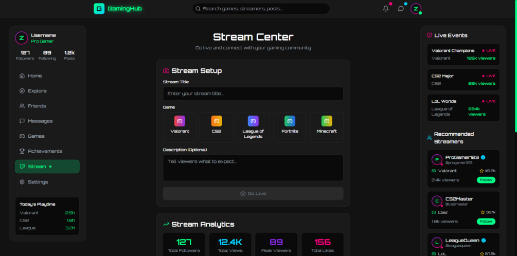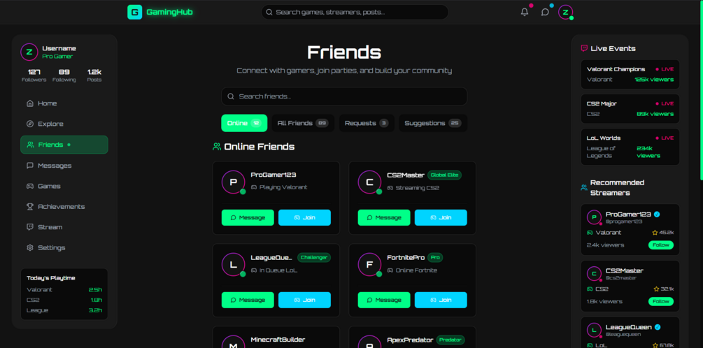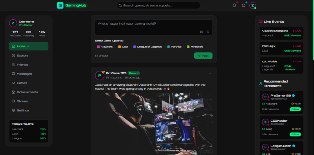 A modern, interactive Gaming/e-sport Community website built with React.js, Next.js, and Tailwind CSS. Features include match tracking, clan management, activity feeds, achievements, and multi-language support.