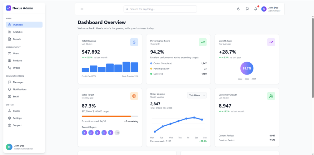 A modern, responsive admin dashboard built with React.js and Tailwind CSS. This dashboard features a clean design with various data visualization widgets and a customizable sidebar.